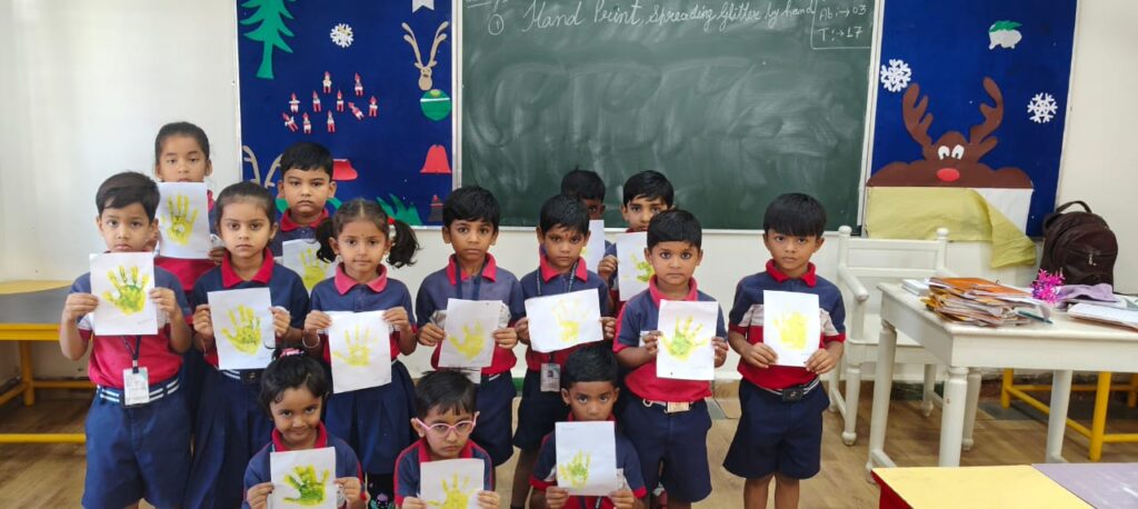 This creative art activity not only provided a hands-on learning experience but also helped enhance sensory development and teamwork among the students. The glitter hand print project stands out as a highlight of our KG I B curriculum, showcasing how fun, interactive classroom activities can inspire creativity and joy in early learning.